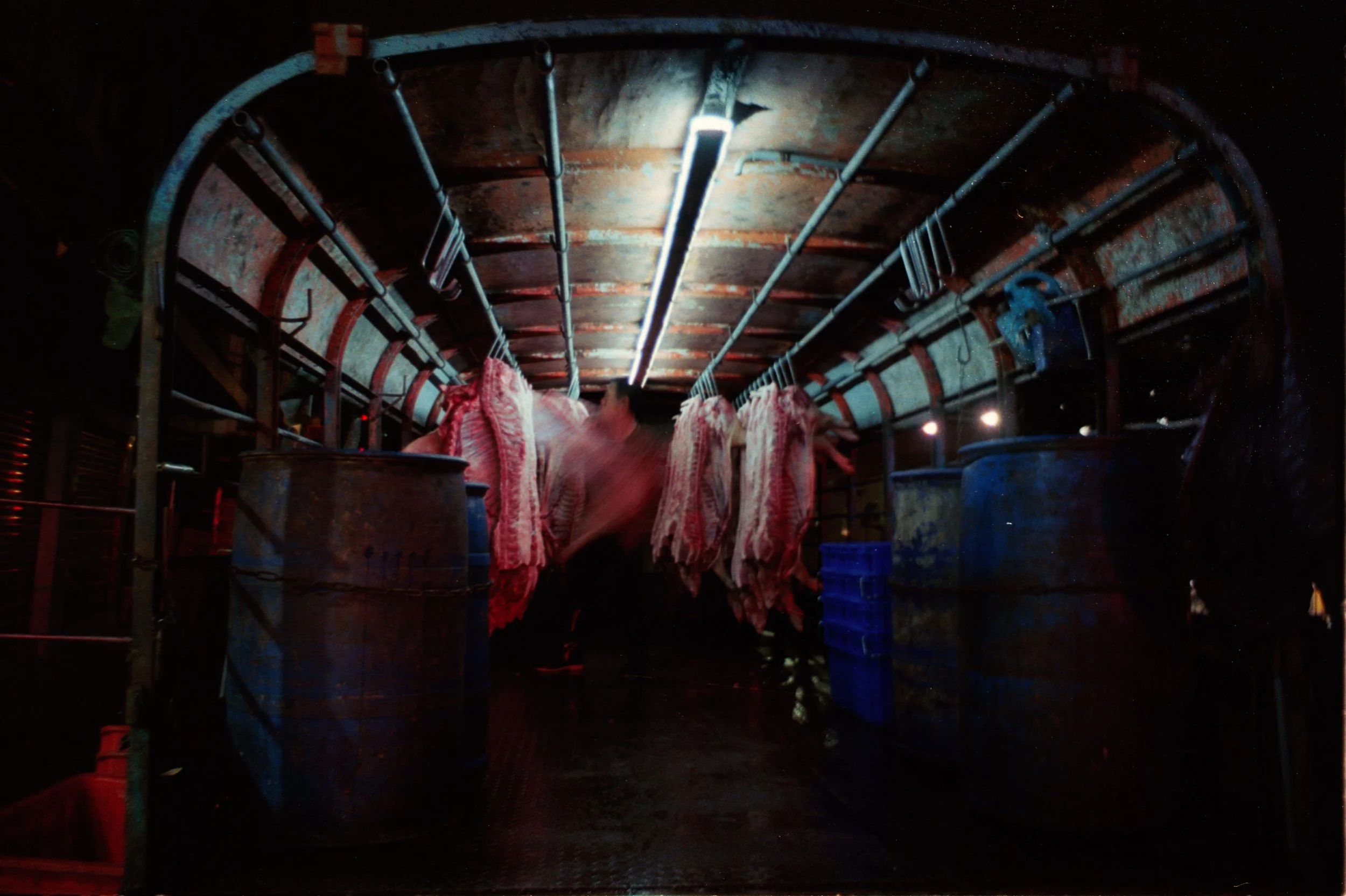 Zhongshan District, Taipei City, Taïwan 2025. Minuit et demi, une legère musique retentit dans les ruelles, un homme livre les carcasses de porc.
