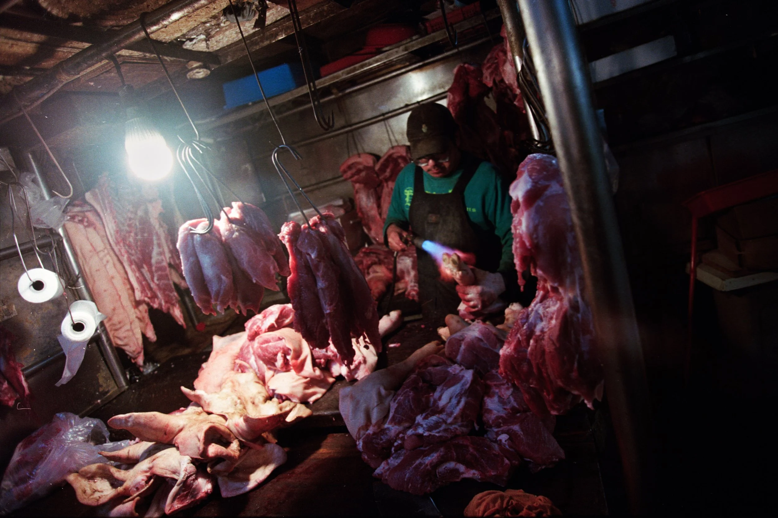 Keelung city, Taiwan 2025. Dans les halles d’un marcher un homme prépare du porc.