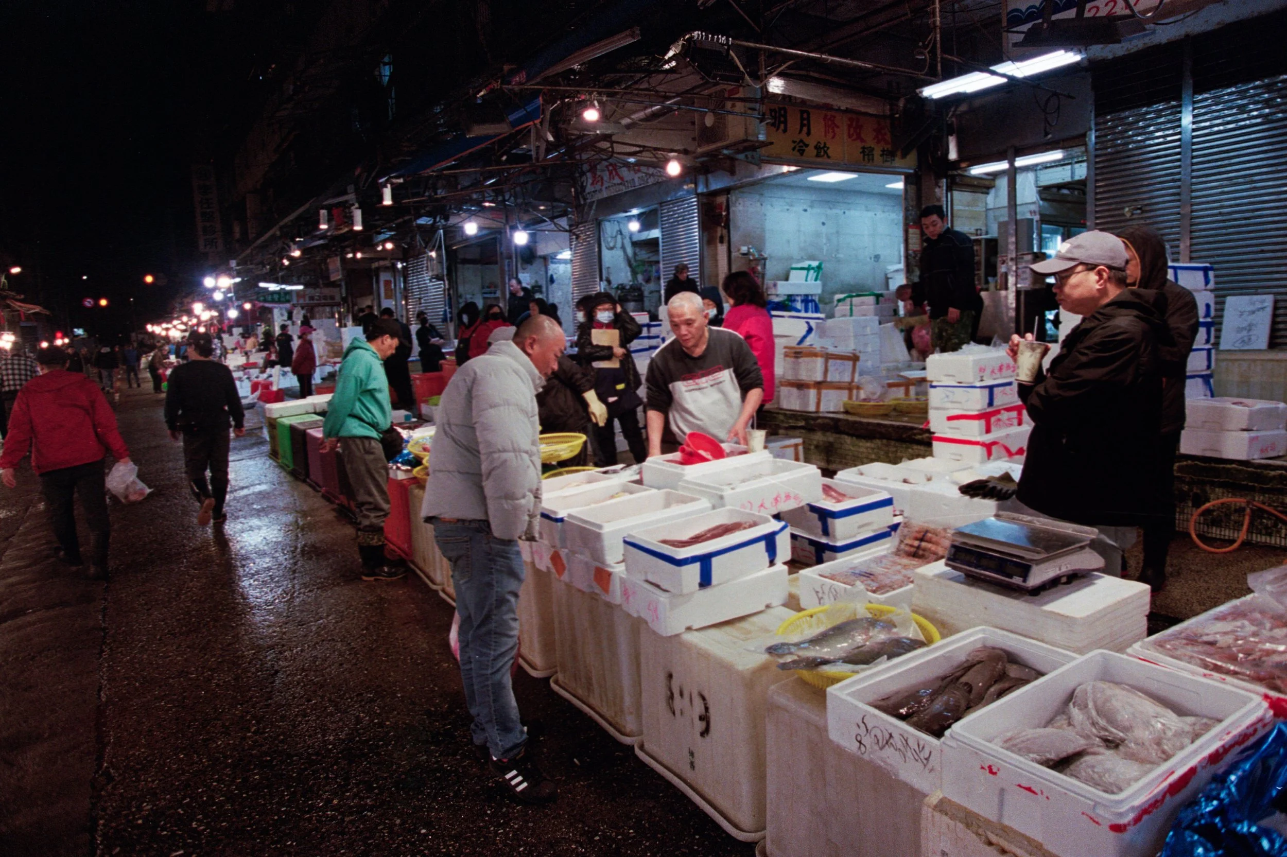 Son rituel est immuable : camions réfrigérés, bacs à glace débordants, et au centre de tout, le Tiaoshou, le commissaire-priseur qui crie en taïwanais à toute vitesse, lit les visages dans la foule et adjuge les lots en quelques secondes. Chefs cuisiniers et revendeurs s'y approvisionnent. À l'aube, les ruelles sont lavées au jet, les invendus s'écoulent dans les égouts vers le port et les oiseaux se chargent du reste.